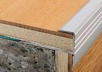 Profily pre ukončenie schodových hrán podľa použitého materiálu so systémom montáže na zápustnú skrutku, alebo v prevedení so samolepiacou vrstvou lepidla.